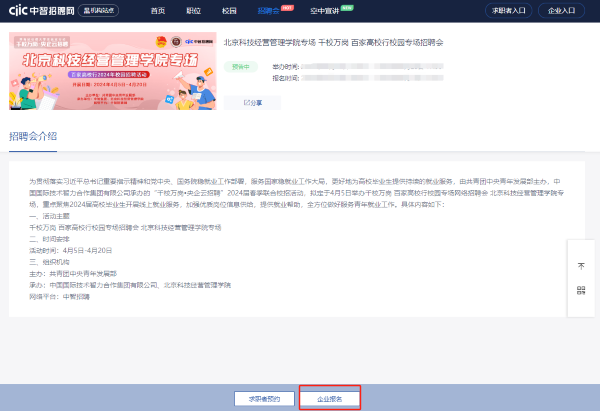 進入招聘會專題頁(https://www.ciiczhaopin.com/jobfair/detail?jobFairId=1773170020553023489},點擊頁面右下角【企業報名】按鈕。