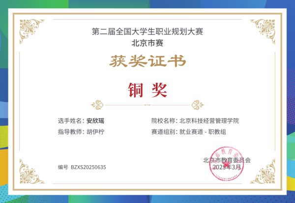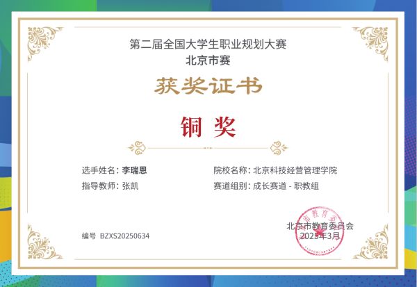 近日,第二屆全國(guó)大學(xué)生職業(yè)規(guī)劃大賽北京市賽總決賽圓滿(mǎn)收官。本次大賽吸引了90余所在京高校踴躍參與,北京市報(bào)名參賽人數(shù)高達(dá)16.8萬(wàn)人,其中成長(zhǎng)賽道12.2萬(wàn)人,就業(yè)賽道4.6萬(wàn)人。經(jīng)過(guò)激烈角逐,僅有710人進(jìn)入市賽,成長(zhǎng)賽道和就業(yè)賽道各355人,最終評(píng)選出市級(jí)金獎(jiǎng)110項(xiàng)、銀獎(jiǎng)169項(xiàng)、銅獎(jiǎng)347項(xiàng)。我校兩位學(xué)生榮獲銅獎(jiǎng),兩位老師榮獲優(yōu)秀指導(dǎo)教師。