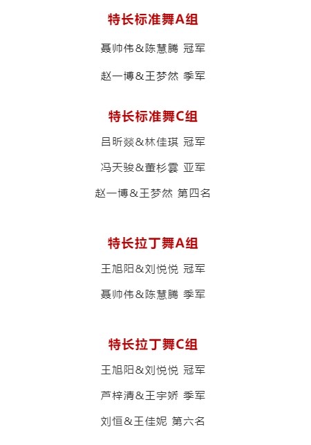 在競爭最為激烈的特長標準舞A組、特長標準舞C組、特長拉丁舞A組、特長拉丁舞C組四個核心專業組別的角逐中,我校選手憑借扎實功底與精湛技藝,強勢包攬全部冠軍。