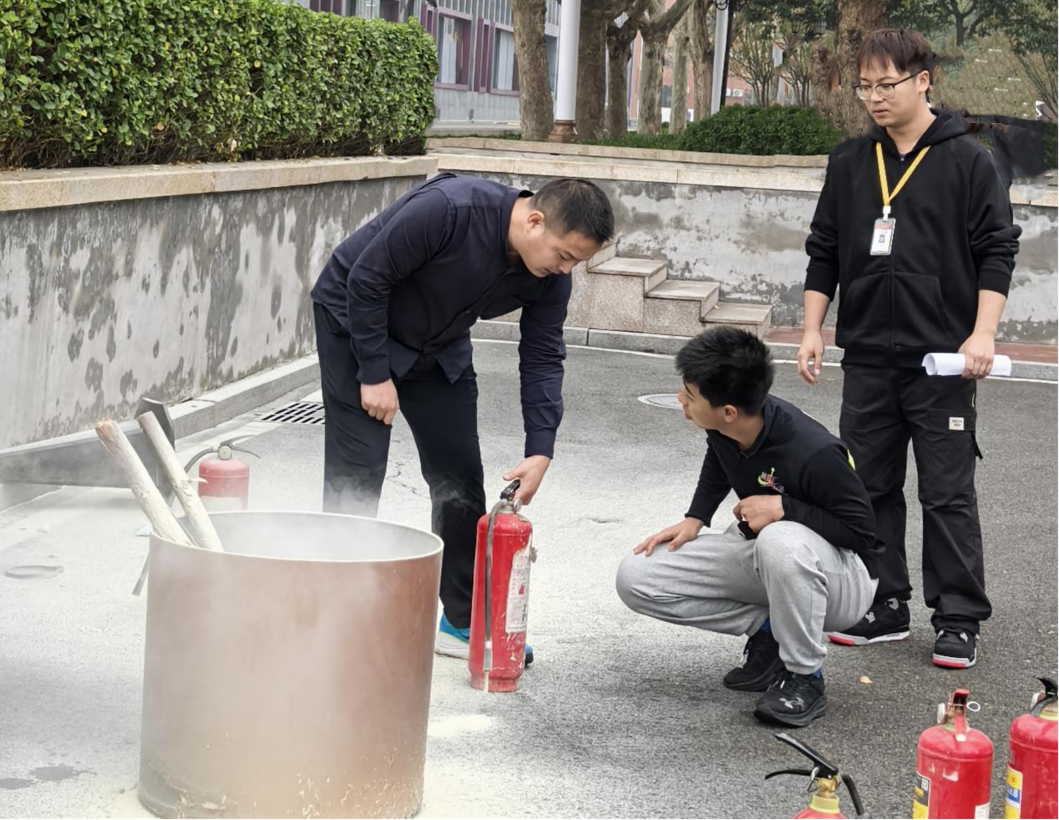 演練最后設(shè)置了消防器材實操環(huán)節(jié)。保衛(wèi)處消防干事現(xiàn)場講解了滅火器的種類與正確使用方法,并指導(dǎo)師生代表進(jìn)行實際操作。通過親身體驗,師生們不僅鞏固了消防知識,更提升了在緊急情況下的實戰(zhàn)能力。